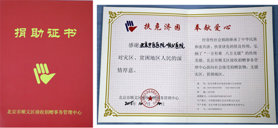 2015年10月12、13日两天,我院根据顺义区卫计委关于开展捐赠活动的文件精神,开展“冬衣送暖”主题捐款活动。活动坚持坚持捐款、捐物自愿原则,全院职工积极踊跃,短短两天内募集善款25470元,活动的开展收到顺义区接收捐赠事物管理中心的肯定,为我院颁发捐赠证书。