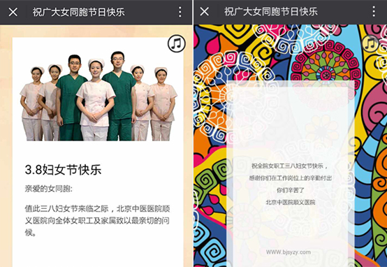 对内,我院通过新媒体,发放电子贺卡,烘托节日气氛,为院内、外女性同胞送去节日祝福,表达医院对女性群体的特别关怀。