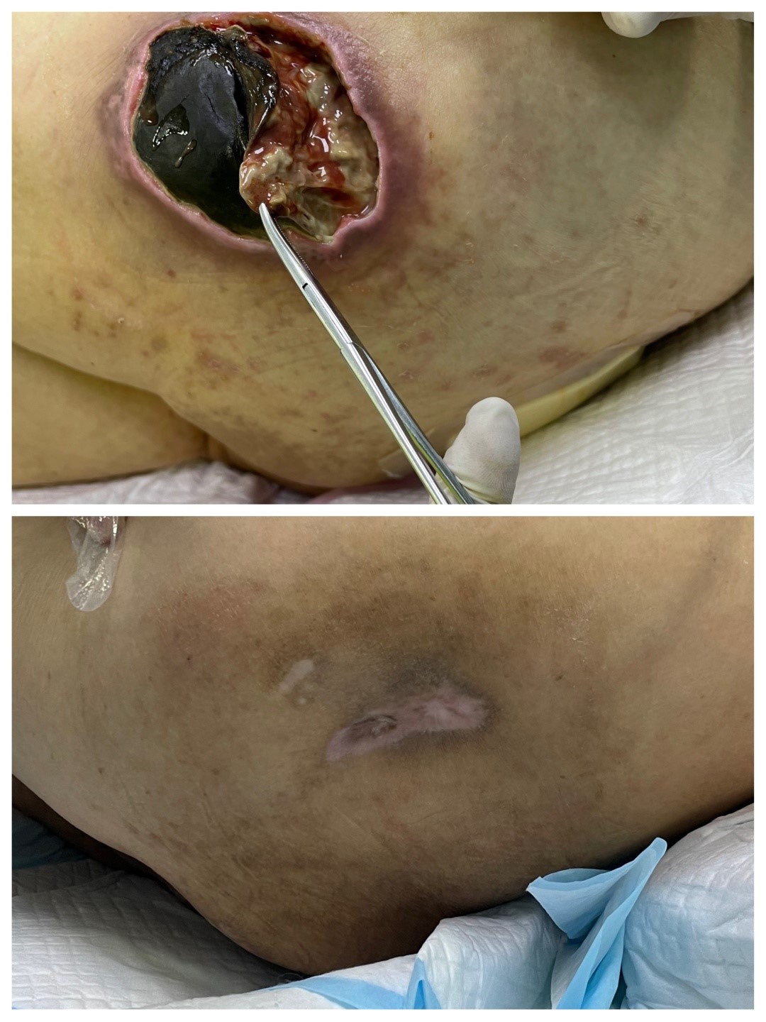 80岁的张奶奶因压疮入院时,痛苦面容,精神萎靡,骶尾部、左右髋部可见鸡蛋大小的“深洞”,伴有大量的渗液,足跟部黑红色,已出现深部组织损伤。压疮的疼痛日夜困扰着张奶奶并牵动着家人的心,张奶奶入院后,伤口护理小组第一时间进行会诊,考虑到年龄及伴有的多种基础疾病,小组为张奶奶制定了有针对性的护理方案。压疮的治疗也经过充分评估,采用保守外科清创、控制渗液、抗菌敷料应用及促进肉芽组织生长的方法,随着压疮愈合情况动态选择适宜敷料,同时医生制定营养支持、控制血糖、口服中药排毒等治疗方案,最终在医护人员的共同努力下,张奶奶的压疮愈合出院了。