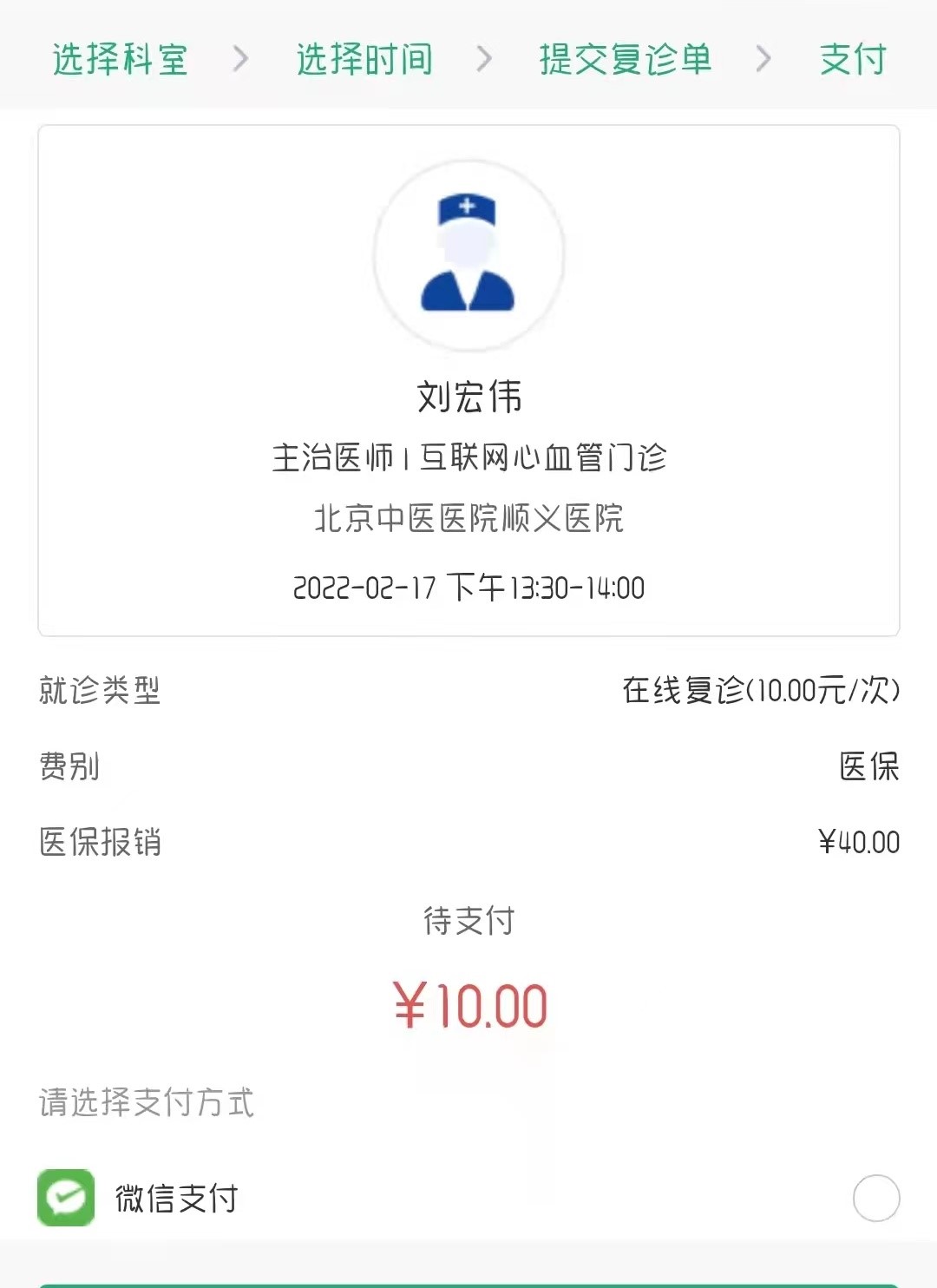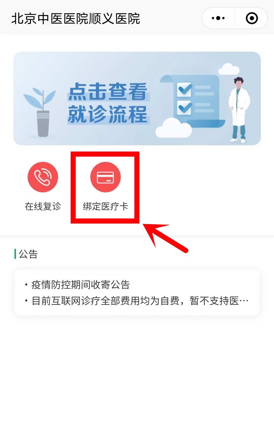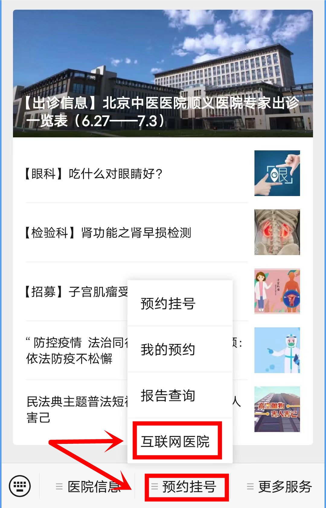 无需单独安装程序,关注“北京中医医院顺义医院微信公众号”,点击下方菜单中的“预约挂号—互联网医院”进入。注册账号进行实名认证,医保患者可选择关联的医保卡档案进行挂号,挂号费医保实时分解报销,即挂号完成。