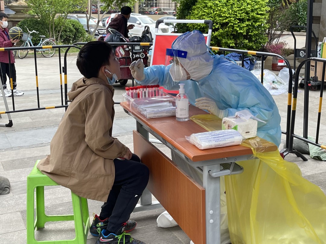 教育处王宇航是名入党积极分子,核酸采样任务重复而繁重,他对待所有的检测者耐心始终如一:张嘴、抬头、不要躲,再坚持一下。检测者的一次提问,可能已是他回复的千百遍,烈日炎炎,他站在核酸检测帐棚中,奔走在居家检测住户的楼层间,身体是疲惫的,精神却乐观向上的。