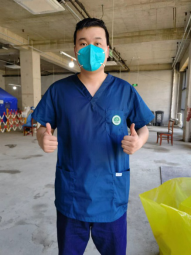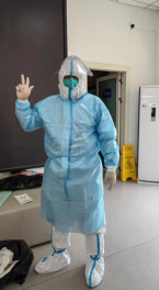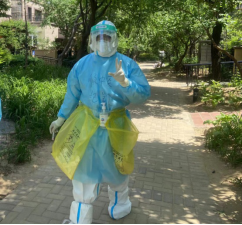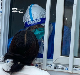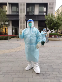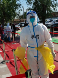李岩瘦弱的身体在疫情面前变得高大,在疫情的号角吹起来时,他勇往直前,在30度的高温、漫天柳絮飞扬的环境中,一干就是3个小时,厚厚的防护服下是浸满汗水的衣服。
