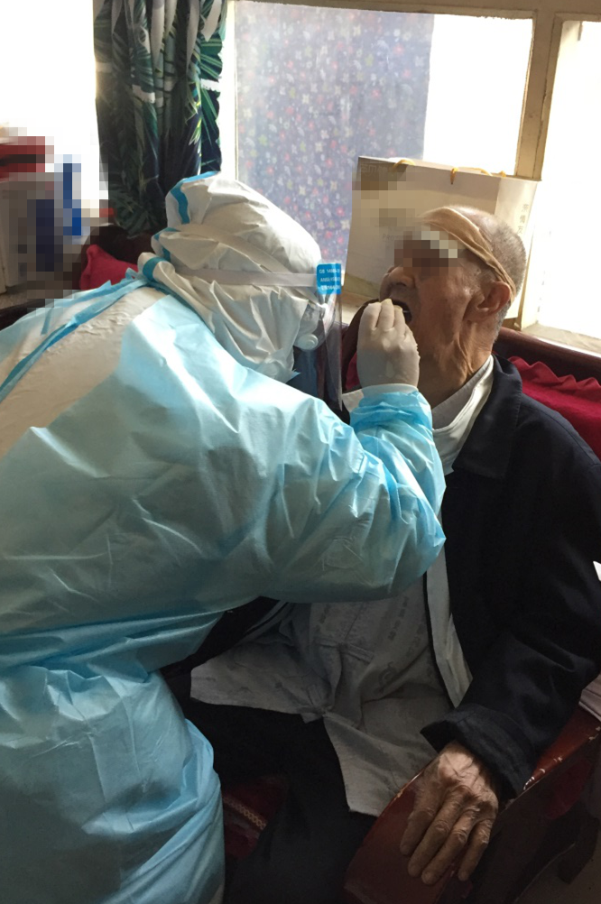 丈夫苏龙专心核酸采集,妻子苏淑伶一旁细心帮忙。