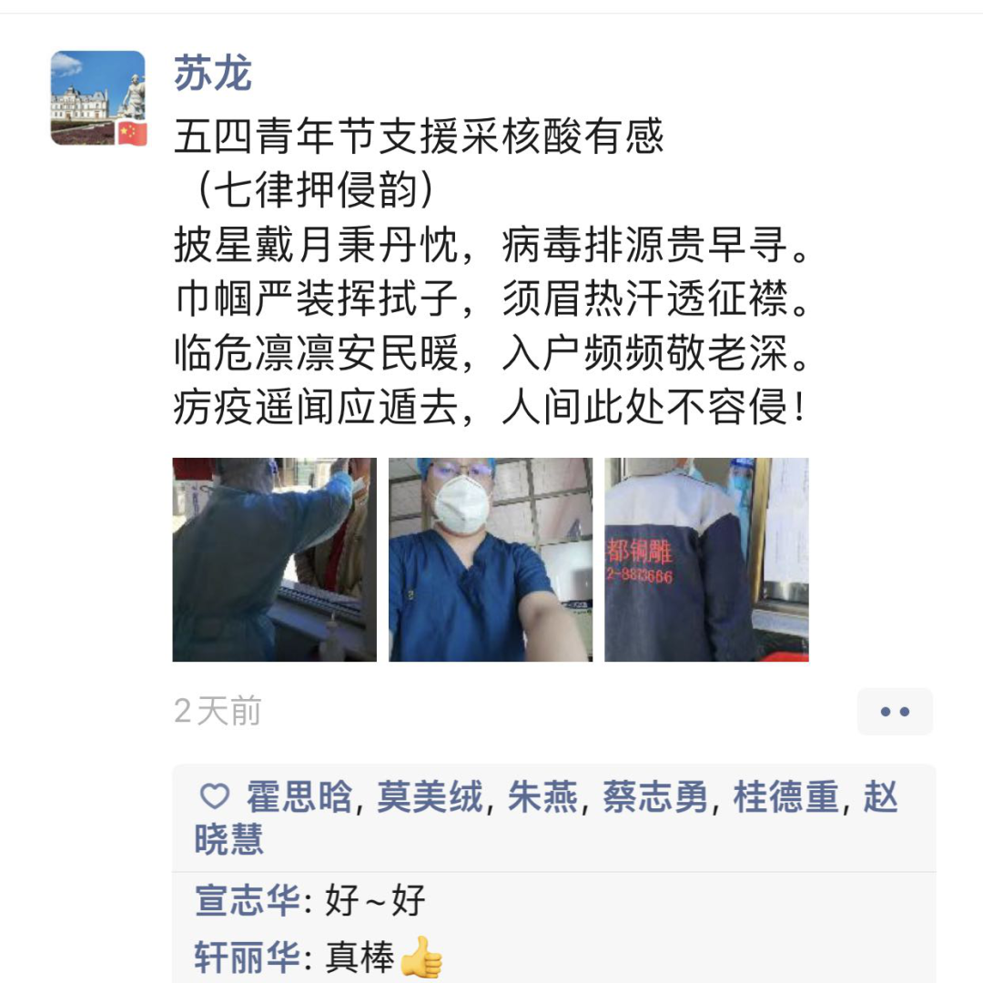 在忙碌完一天的核酸采集任务后,苏龙有感而发,作诗一首。