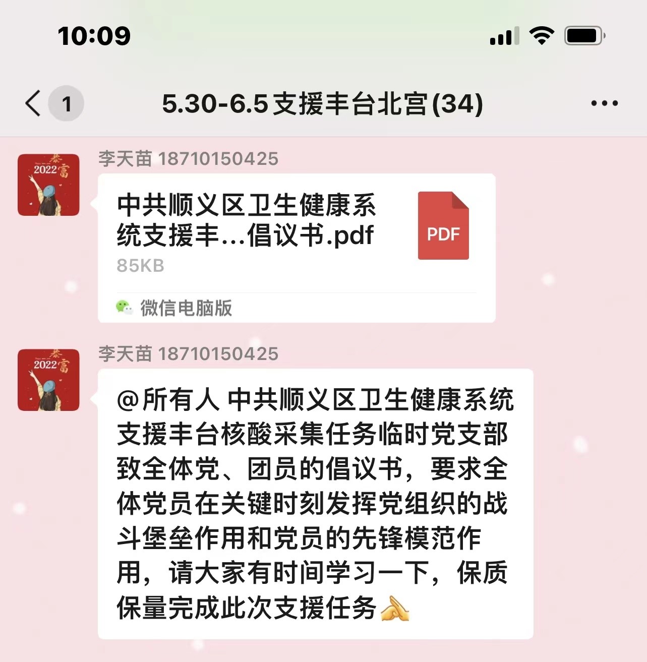 为持续做好核酸采集支援工作,充分发挥党支部在一线的战斗堡垒作用和党员先锋模范作用,领导带动全体成员争先创优,成立了中共顺义区卫生健康系统支援丰台核酸采集任务临时党支部。我院本次支援丰台党员同志共计10名,成立了北京中医医院顺义医院党小组。依托党小组,开展院感防控、沟通协调、点位联动、物资调配、后勤保障等工作,确保核酸采集工作有序开展。