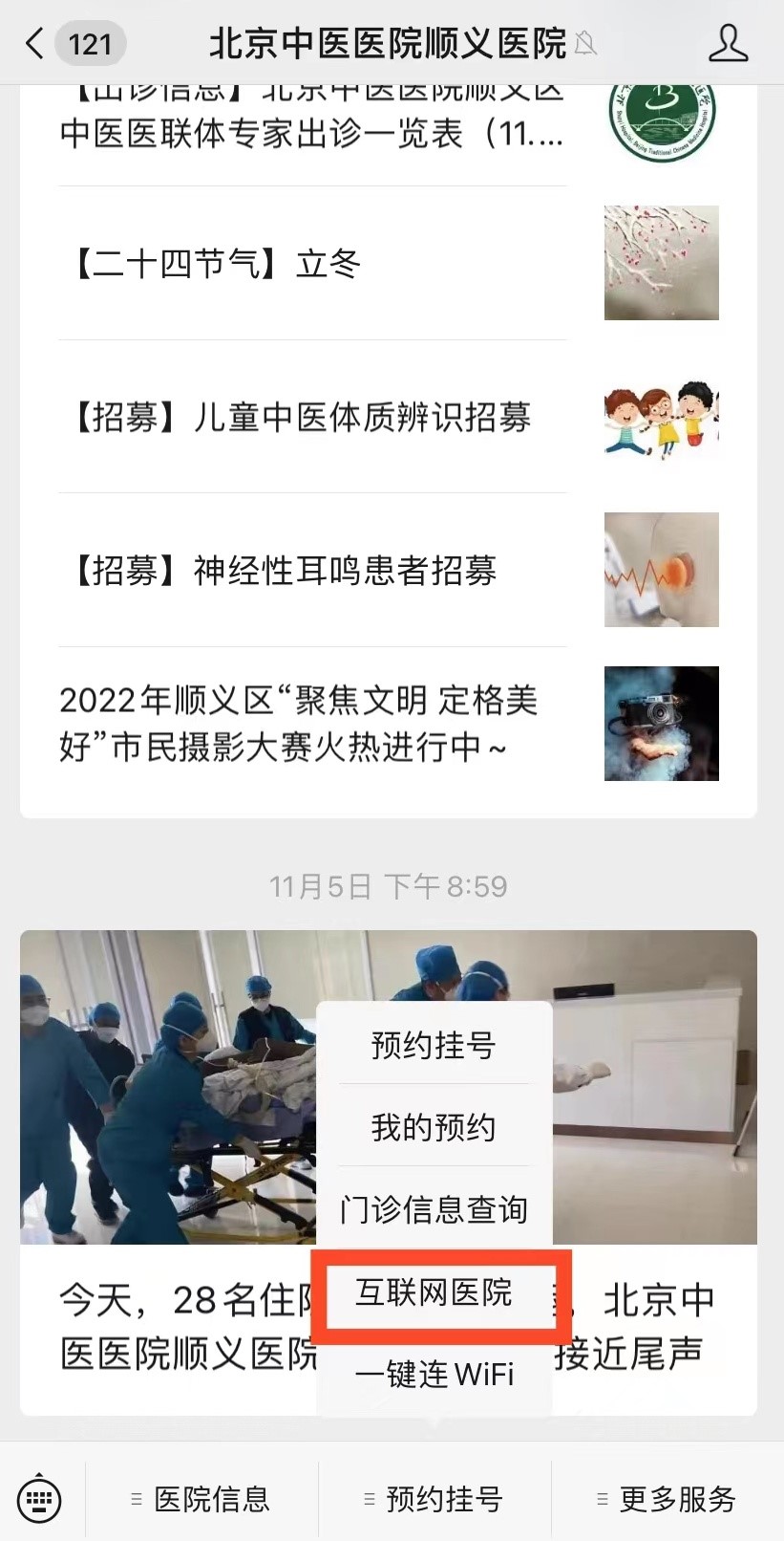 无需单独安装程序,关注“北京中医医院顺义医院微信公众号”,点击下方菜单中的“预约挂号—互联网医院”进入。注册账号进行实名认证,医保患者可选择关联的医保卡档案进行挂号,挂号费医保实时分解报销,即挂号完成。