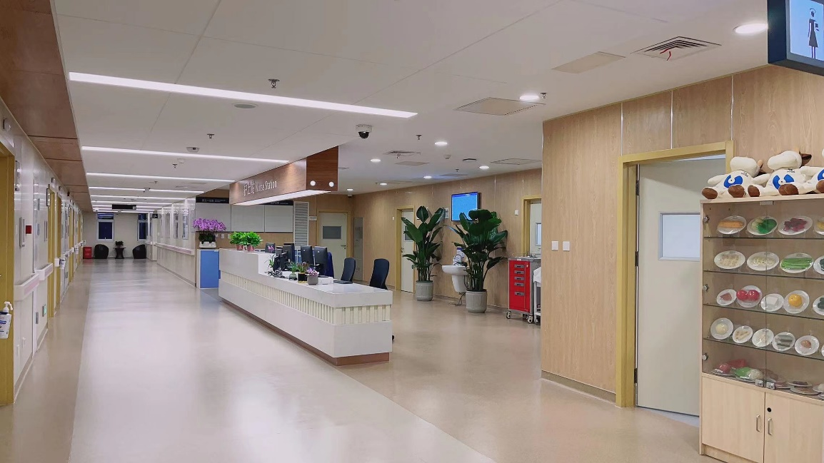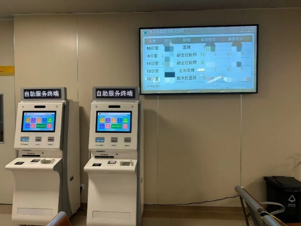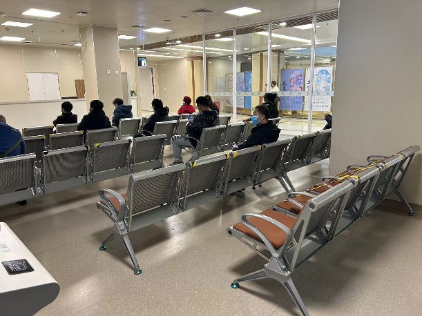 门诊候诊大厅,座位充足,疫情期间保证患者等待就诊时隔座待诊。等候区墙屏滚动播放患者就诊信息:就诊诊室、等待人数,方便患者随时查看就诊诊室和医生信息。呼叫系统提醒当前就诊患者及下一名就诊人员待诊,等待就诊井然有序;候诊大厅设有多台多功能自助机,实现患者快捷取号、自助挂号、缴费、自助打印门诊病例和化验报告单等功能。
