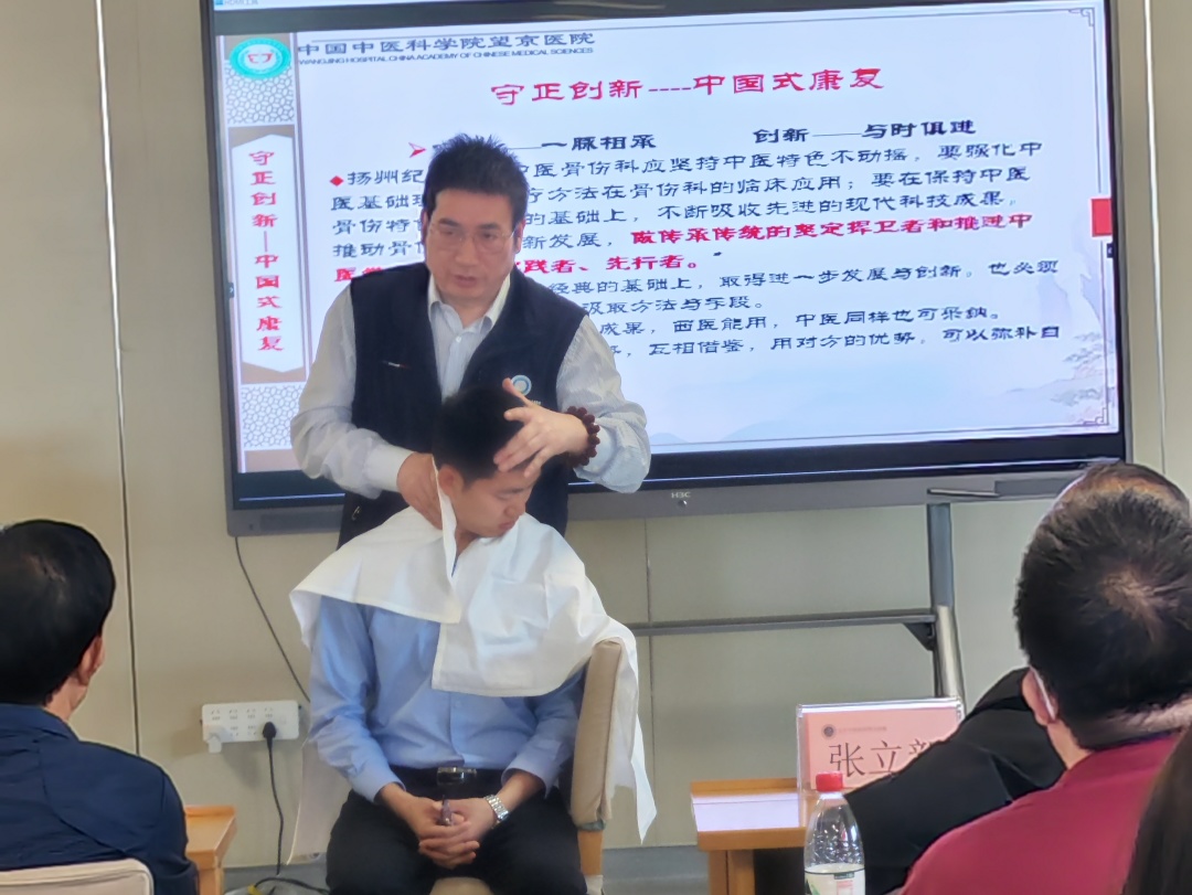 北京中医药大学东直门医院方建国主任医师讲授“清宫正骨理筋术”,强调清宫正骨流派手法“轻、巧、柔、和”等特点,并现场进行手法演示。
