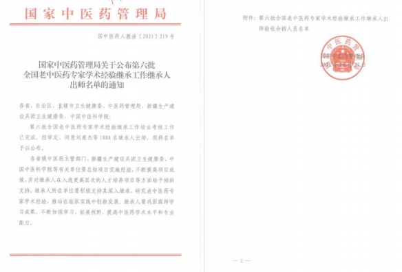 第六批全国老中医药专家学术经验继承工作于 2017 年启动,我院高才达主任医师、崔德成主任医师担任指导老师,带教 4 名继承人。继承工作期间,4 名弟子跟师学习 978 个工作日,完成临床医案、学习心得等 604 篇,传承名老中医的思想经验,在《世界中医药》《辽宁中医杂志》《现代生物医学进展》《国际中医中药杂志》等核心期刊发表传承论文 6 篇、参与编写传承著作 2 部。