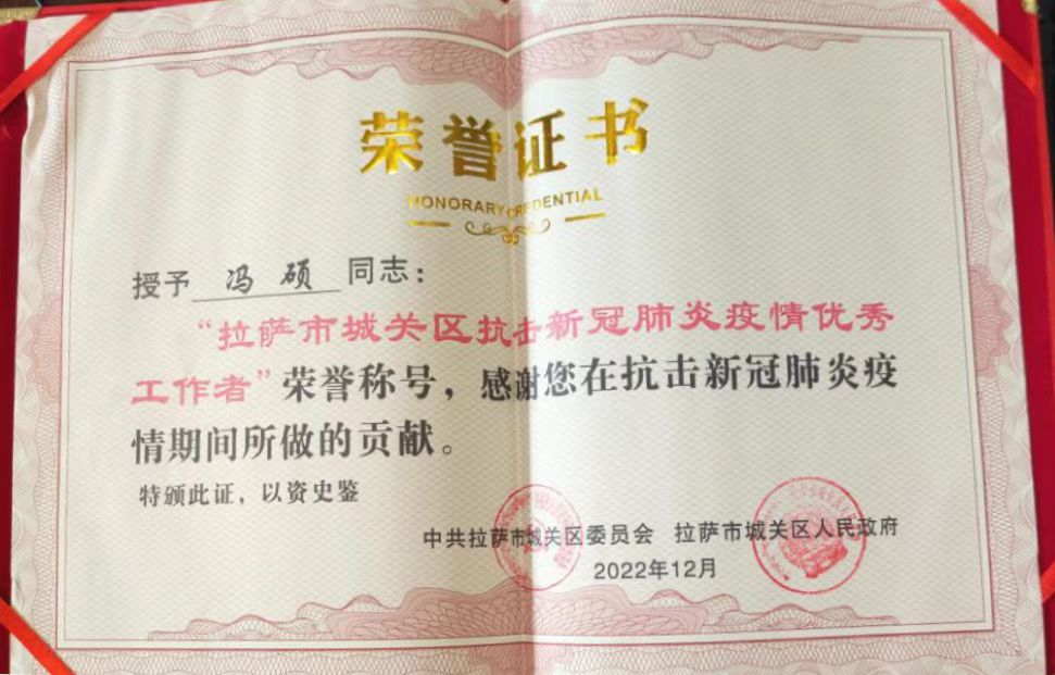 初入西藏,冯硕还没适应高原的缺氧环境,就毅然投入到了抗疫工作的前线,并为发热病房改造分区提供规划建议,参与了尼木医院新冠收治诊疗方案及病例转运方案的撰写等,为拉萨市的疫情防控工作做出了积极贡献,获得了“拉萨市城关区抗击新冠肺炎疫情优秀工作者”的荣誉称号。
