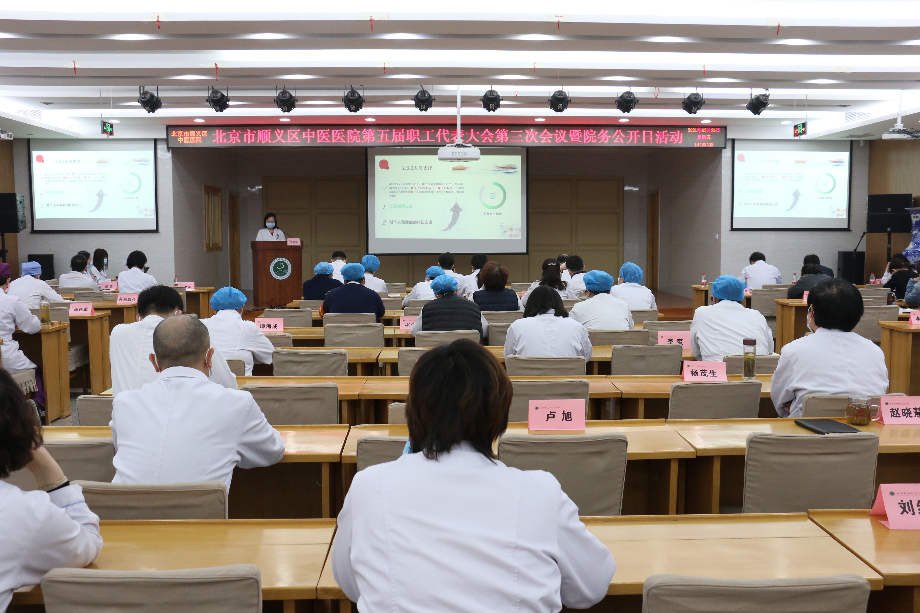 春风化雨,万物复苏。3月26日下午,北京市顺义区中医医院顺利召开第五届职工代表大会第三次会议暨院务公开日活动,来自全院各科的职工代表参加了会议,此次会议会场严格落实疫情防控措施,提前对会场进行了消毒通风,并在会场入口处安排扫码、测温、登记签到,参会人员落实个人防护指引,会议全程佩戴口罩,保持1米以上间隔就坐。