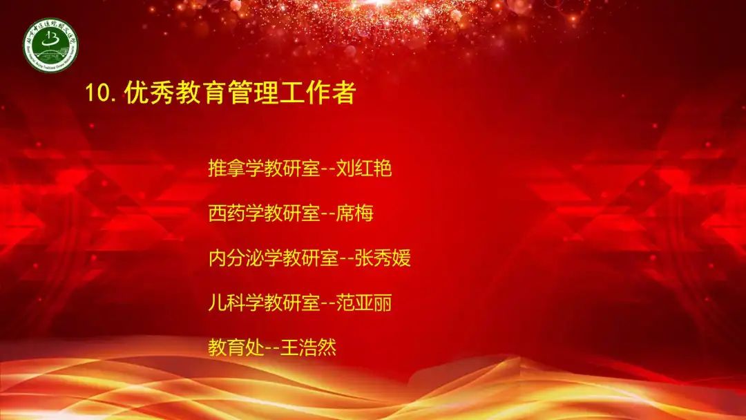 王继东书记在致辞中向长期为医院教育事业奉献的教师致以节日的祝福和感谢,对医院自托管以来教育教学、中医传承、继续教育等方面取得的成绩表示肯定,勉励教师立德树人,传承精华,守正创新,为培养中医药人才而共同努力。