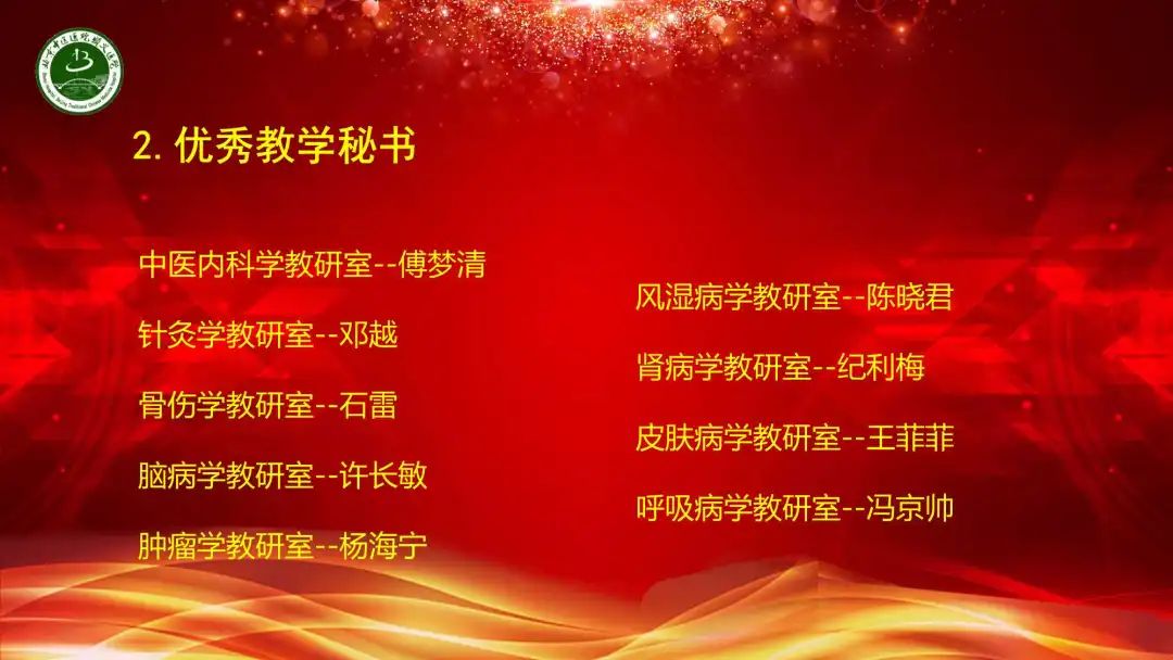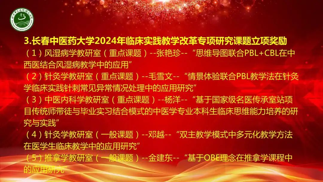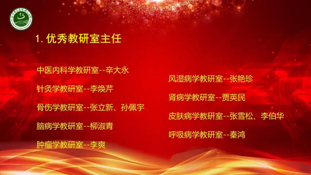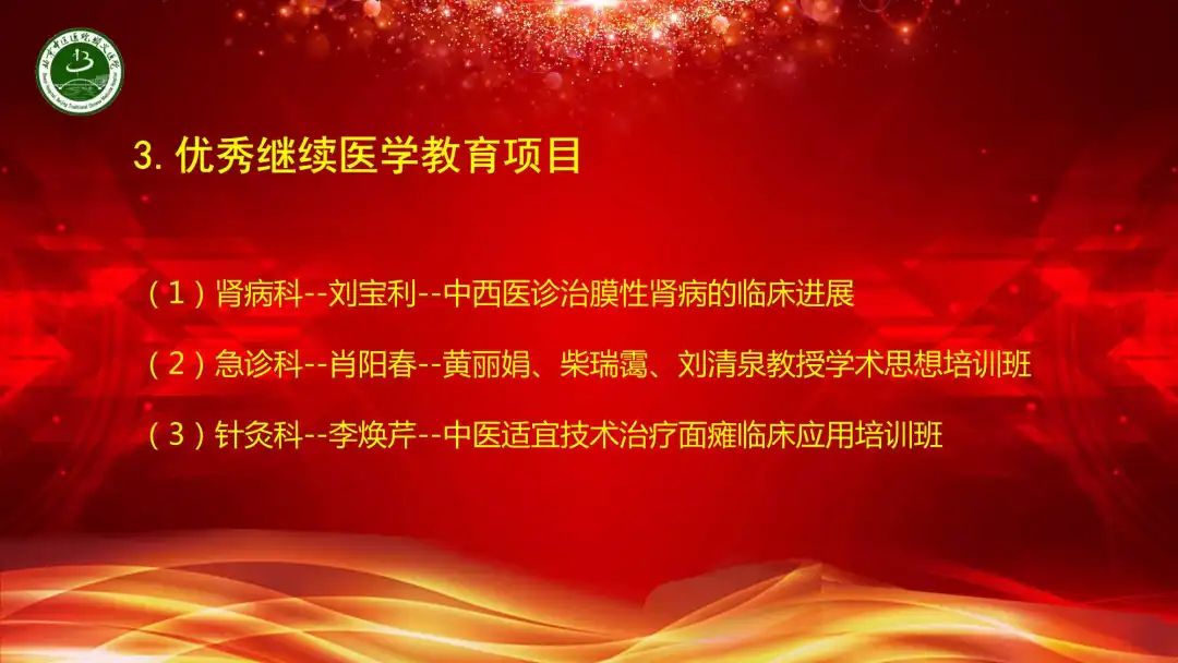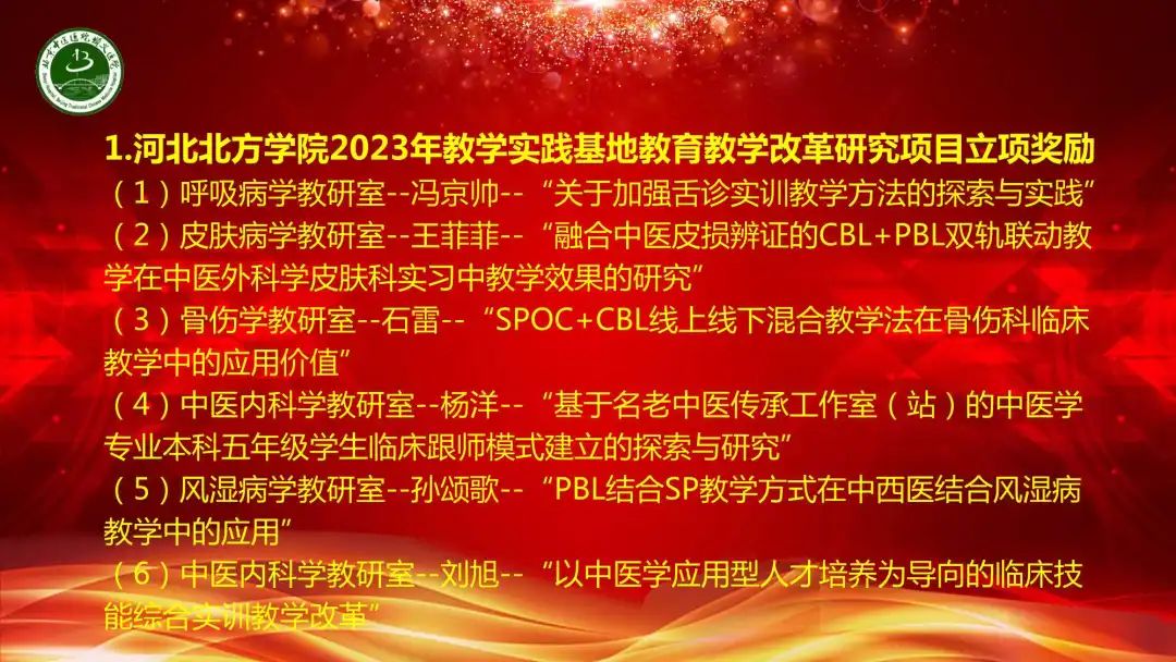 回顾这一学年的教学工作,与北京中医药大学管理学院达成合作意向,2位教师荣获河北北方学院第十届青年教师教学竞赛三等奖,18名教师通过北京中医药大学临床教师上岗考核,立项长春中医药大学及河北北方学院教改课题11项。15名继承人通过北京市中医药管理局师承项目阶段考核,国家级、市级继续医学教育项目数量保持增长,立项北京市中医药继续教育品牌项目。我们行稳致远,进而有为,圆满完成了教学医院各项教学任务。