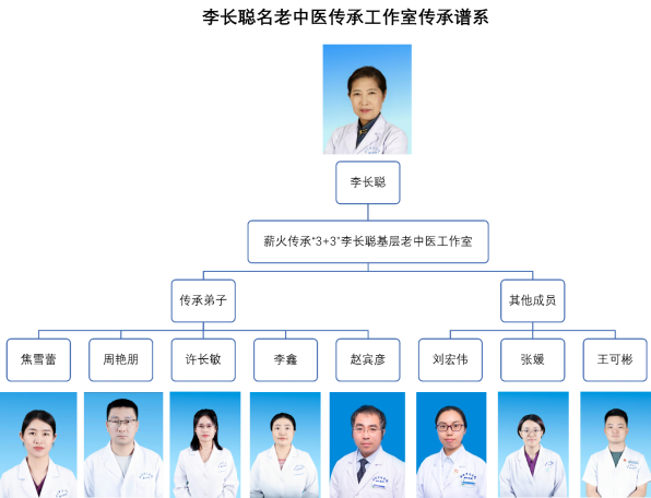 北京中医药薪火传承“3+3”工程李长聪基层老中医传承工作室2023年10月获批,项目建设依托于北京中医医院顺义医院,目前工作室成员包括李长聪主任医师及传承弟子、成员共有9人,李长聪主任医师为指导老师,室站负责人为焦雪蕾副主任医师。其余传承弟子分别为赵宾彦副主任医师、周艳朋主治医师、李鑫主治医师、许长敏主治医师,工作室其他成员有刘宏伟副主任医师、张媛主治医师、王可彬医师。